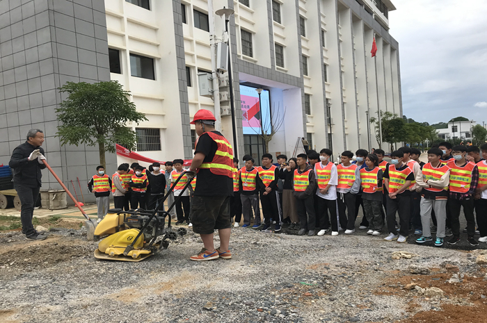 學生(shēng)在展示使用平板夯壓(yā)實路基填土